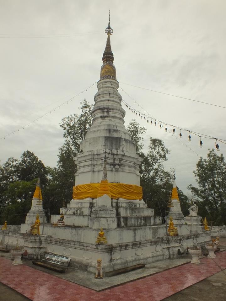 การประดับตกแต่งตั้งแต่องค์ระฆังขึ้นไป มีการประดับตกแต่งด้วยการปิดกระจกเกรียบสีเหลืองทอง ซึ่งทำให้องค์เจดีย์มีความสวยงามที่โดดเด่น ประกอบกับตำแหน่งที่ตั้งอยู่บนม่อนดอย จึงทำให้สังเกตเห็นองค์เจดีย์ได้ตั้งแต่ระยะไกล หอธรรม มีลักษณะเป็นอาคาร 2 ชั้น ตั้งอยู่ด้านหลังของวิหาร ชั้นล่างเป็นอาคารสร้างด้วยการก่ออิฐฉาบปูน เจาะช่องประตูด้านหน้า 1 ช่อง ด้านข้างซ้าย – ขวา เจาะช่องหน้าต่างเพื่อถ่ายเทอากาศและรับแสงด้านละ 3 ช่อง ส่วนชั้น 2 เป็นอาคารไม้ ภายในมีตู้เก็บพระธรรมขนาดใหญ่ว่างไว้ตรงกลางอาคาร โดยสร้างติดกับตัวอาคารอย่างถาวร ในตู้มีการเก็บคัมภีร์ใบลานที่เขียนเป็นตัวอักษรล้านนา ปัจจุบันเหลืออยู่จำนวนกี่ผูก