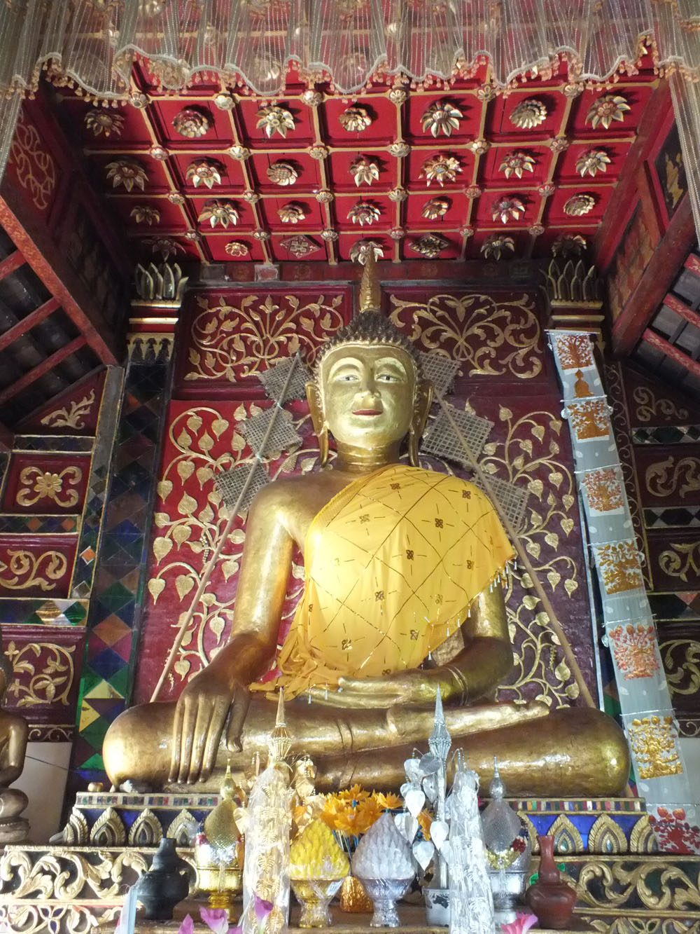 ภายในวิหารประดิษฐานพระประธานองค์ใหญ่ พุทธลักษณะเป็นพระพุทธรูปปางมารวิชัยปูนปั้นลงรักปิดทอง เหนือองค์พระพุทธรูปมีดาวเพดานแกะเป็นรูปดอกบัวลงรักปิดทอง วางในช่องแก้ว จำนวน 42 ช่อง นอกจากนี้มีการตกแต่งเสา ขื่อม้าต่างไหม ด้วยลายคำอันเป็นเทคนิคที่นิยมของช่างชาวล้านนาสำหรับการตกแต่งวิหาร