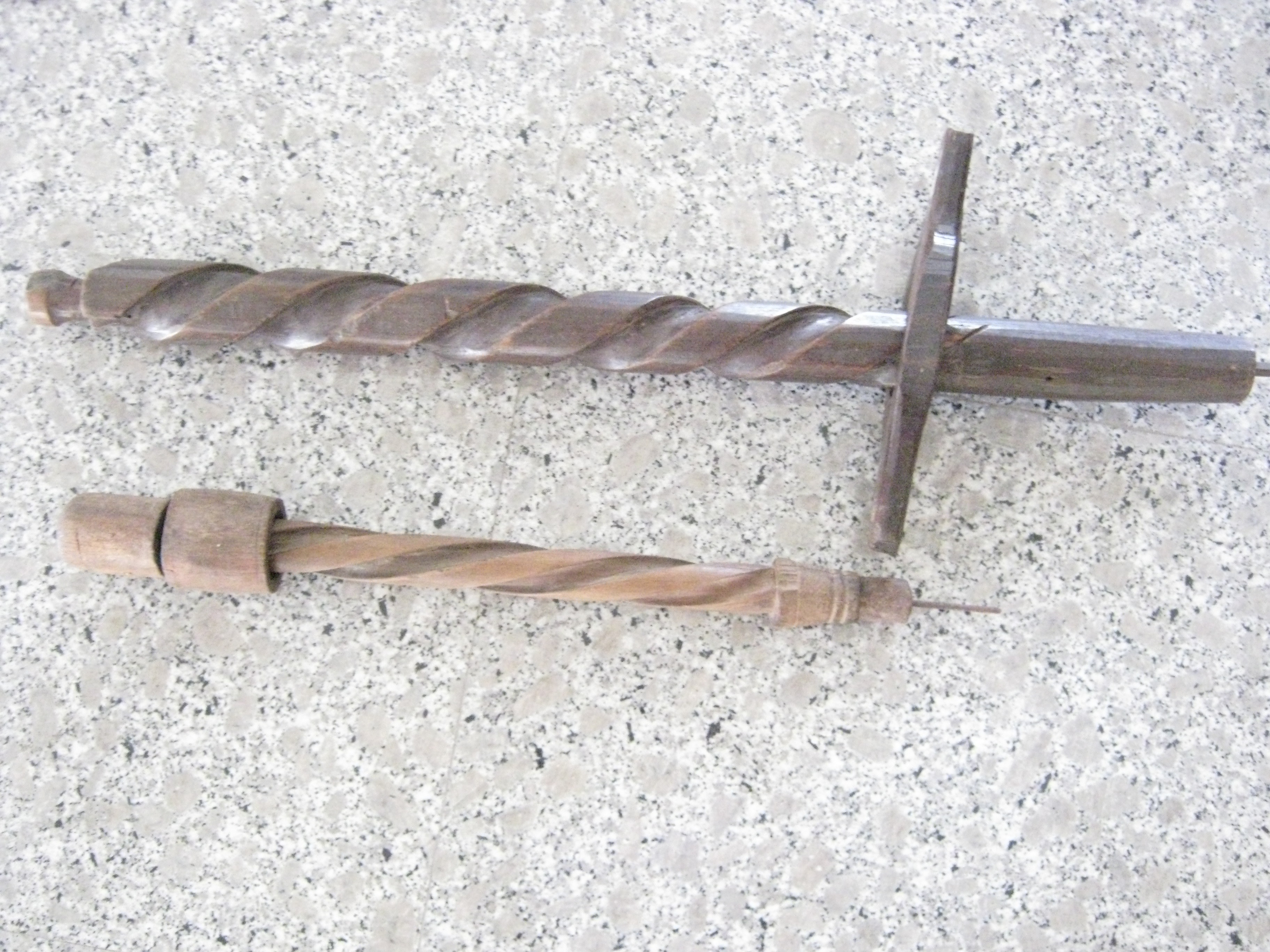 เป็นเกลียวเหมือนบิดหล่า ตัวส่วนเป็นไม้ ดอกสว่านเป็นเหล็ก