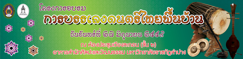 หัวข้อ : โครงการอบรม การบรรเลงดนตรีไทยพื้นบ้าน วันจันทร์ ที่ 27 มิถุนายน 2559 ณ ห้องประชุมเวียงละกอน อาคารสำนักศิลปะและวัฒนธรรม มหาวิทยาลัยราชภัฎลำปาง