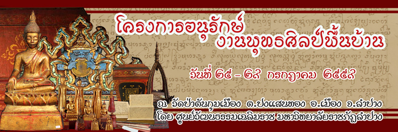 รายละเอียด : โครงการอนุรักษ์ งานพุทธศิลป์พื้นบ้าน ในวันที่ 25 - 29 กรกฎาคม 2559 ณ วัดป่าตันกุมเมือง ต.ปงแสนทอง อ.เมือง จ.ลำปาง โดยศูนย์วัฒนธรรมเฉลิมราช มหาวิทยาลัยราชภัฏลำปาง
