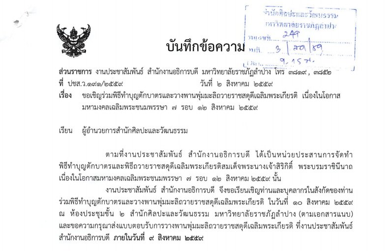 หัวข้อ : ขอเชิญร่วมพิธีทำบุญตักบาตรและวางพานพุ่มมะลิถวายราชสดุดีเฉลิมพระเกียรติ เนื่องในโอกาสมหามงคล เฉลิมพระชนมพรรษา 7 รอบ 12 สิงหาคม 2559