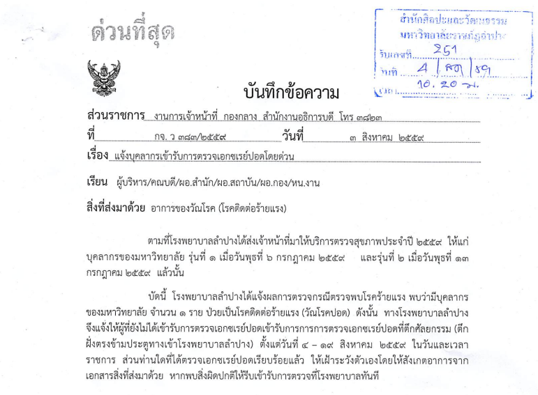 หัวข้อ : โรงพยาบาลลำปางแจ้งให้ผู้ที่ยังไม่ได้รับการตรวจเอกซเรย์ปอด เข้ารับการตรวจที่ตึกศัลยกรรม ตั้งแต่วันที่ 4 - 19 สิงหาคม 2559 ในวันและเวลาราชการ