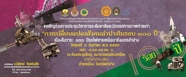 หัวข้อ : ขอเชิญร่วมการประชุมวิชาการระดับชาติและนิทรรศการภาพถ่ายเก่า : เรื่อง การเปลี่ยนแปลงสังคมลำปางในรอบ 100 ปี เนื่องในวาระ 100 ปี รถไฟสายเหนือมาถึงนครลำปาง วันศุกร์ที่ 9 กันยายน 2559