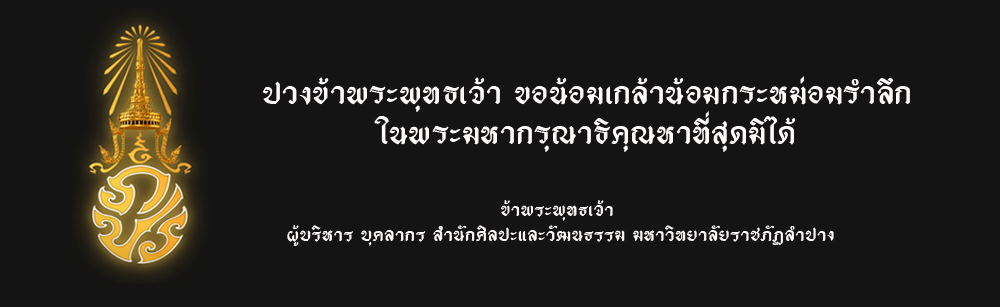 รายละเอียด : ปวงข้าพระพุทธเจ้า ขอน้อมเกล้าน้อมกระหม่อมรำลึกในพระมหากรุณาธิคุณหาที่สุดมิได้ ข้าพระพุทธเจ้า ผู้บริหาร บุคลากร สำนักศิลปะและวัฒนธรรม มหาวิทยาลัยราชภัฏลำปาง