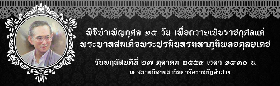 รายละเอียด : ขอเชิญเข้าร่วมพิธีบำเพ็ญกุศลปัณรสมวาร(15วัน) เพื่อถวายเป็นราชกุศลแด่ พระบาทสมเด็จพระปรมินทรมหาภูมิพลอดุลยเดช ในวันพฤหัสบดี ที่ 27 ตุลาคม 2559 เวลา 18.30 น. ณ สนามกีฬามหาวิทยาลัยราชภัฏลำปาง