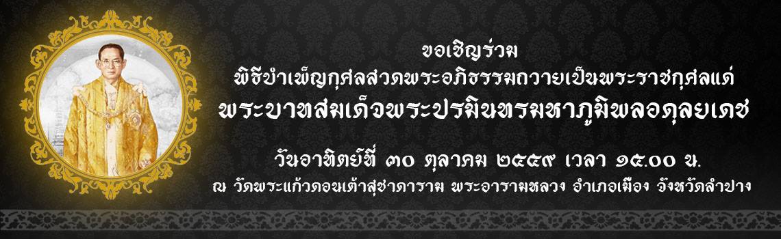 รายละเอียด : ขอเชิญร่วมพิธีบำเพ็ญกุศลสวดอภิธรรมเพื่อถวายเป็นพระราชกุศลแด่พระบาทสมเด็จพระปรมินทรมหาภูมิพลอดุลยเดช วันอาทิตย์ที่ 30 ตุลาคม 2559 เวลา 15.00 น. ณ วัดพระแก้วดอนเต้าสุชาดาราม พระอารามหลวง อำเภอเมือง จังหวัดลำปาง