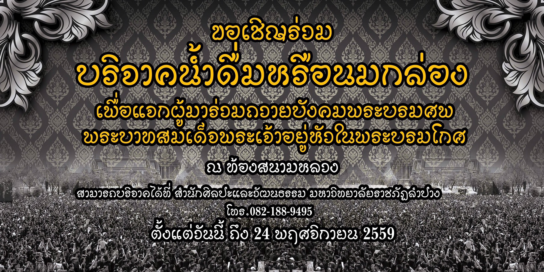 หัวข้อ : ขอเชิญร่วมบริจาคน้ำดื่มหรือนมกล่องเพื่อแจกผู้มาร่วมถวายบังคมพระบรมศพ พระบาทสมเด็จพระเจ้าอยู่หัวในพระบรมโกศ ณ ท้องสนามหลวง สามารถบริจาคได้ที่ สำนักศิลปะและวัฒนธรรม มหาวิทยาลัยราชภัฏลำปาง