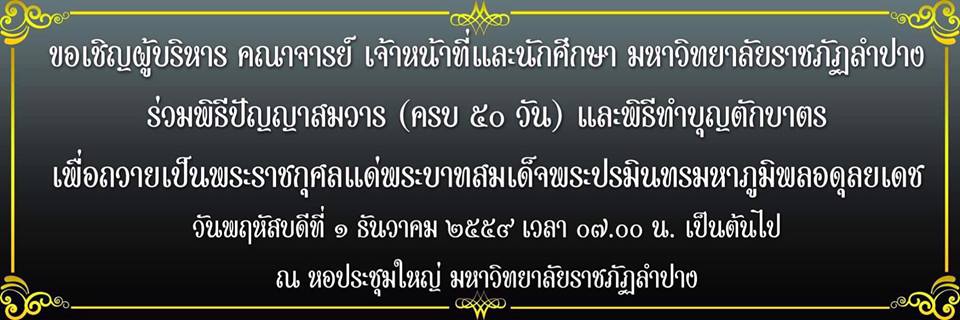 หัวข้อ : พิธีบำเพ็ญกุศลปัญญาสมวาร (ครบรอบ 50 วัน) และพิธีตักบาตรเพื่อถวายเป็นพระราชกุศลแด่พระบาทสมเด็จพระปรมินทรมหาภูมิพลอดุลยเดช วันที่ 1 ธันวาคม 2559 เวลา 07.00 น. ณ หอประชุมใหญ่ มหาวิทยาลัยราชภัฏลำปาง