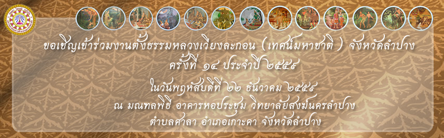 หัวข้อ : ขอเชิญร่วมงานตั้งธรรมหลวงเวียงละกอน (เทศน์มหาชาติ) ครั้งที่ 14 ประจำปี 2559 ในวันที่ 22 ธันวาคม 2559 ณ มณฑลพิธี อาคารหอประชุม วิทยาลัยสงฆ์นครลำปาง ตำบลศาลา อำเภอเกาะคา จังหวัดลำปาง