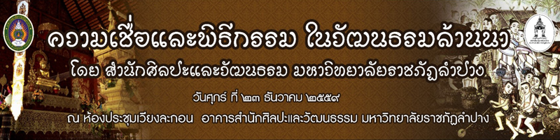 รายละเอียด : ขอเชิญผู้สนใจเข้าร่วมโครงการอบรมศาสนพิธี : ความเชื่อและพิธีกรรม ในวัฒนธรรมล้านนา ในวันศุกร์ที่ 23 ธันวาคม 2559 เวลา 08.00 - 16.00 น. ณ ห้องประชุมเวียงละกอน ชั้น 2 สำนักศิลปะและวัฒนธรรม มหาวิทยลัยราชภัฏลำปาง