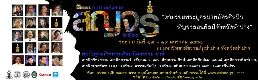 หัวข้อ : ขอเชิญเข้าร่วมโครงการศิลปินแห่งชาติสัญจร 2560 ตามรอยพระยุคลบาทอัครศิลปิน สัญจรสอนศิลป์จังหวัดลำปาง ระหว่างวันที่ 18-19 มกราคม 2560 ณ มหาวิทยาลัยราชภัฏลำปาง