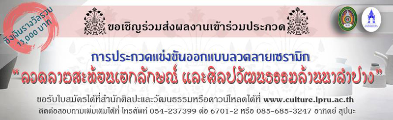 หัวข้อ : ขอเชิญร่วมส่งผลงานเข้าร่วมประกวด การประกวดแข่งขันออกแบบลวดลายเซรามิก ลวดลายสะท้อนเอกลักษณ์และศิลปวัฒนธรรมล้านนาลำปาง