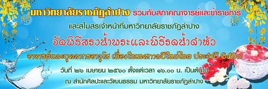 หัวข้อ : มหาวิทยาลัยราชภัฏลำปาง ร่วมกับสภาคณาจารย์และข้าราชการ และสโมสรเจ้าหน้าที่มหาวิทยาลัยราชภัฏลำปาง จัดพิธีสรงน้ำพระและพิธีรดน้ำดำหัวอาจารย์และบุคลากรอาวุโส เนื่องในเทศกาลปีใหม่ไทย ประจำปี 2560