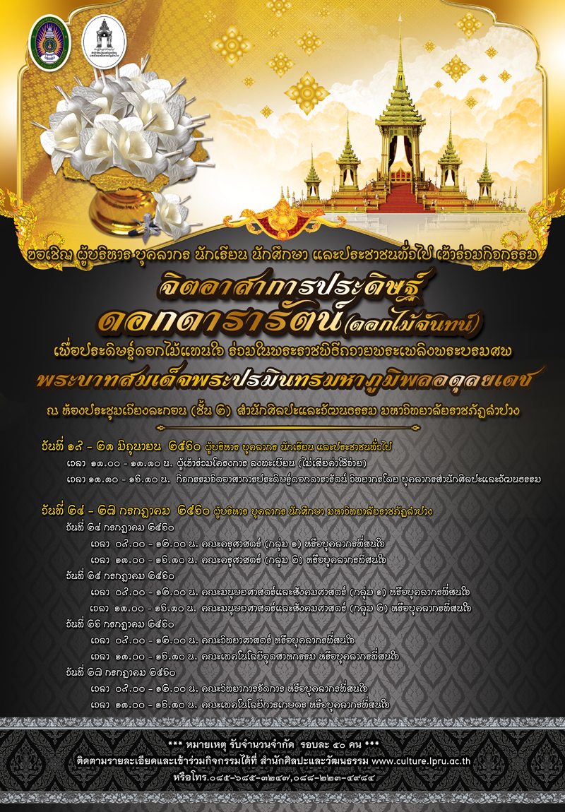 สำนักศิลปะและวัฒนธรรม ขอเชิญชวนผู้ที่สนใจเข้าร่วมกิจกรรมจิตอาสาประดิษฐ์ดอกดารารัตน์ (ดอกไม้จันทน์) เพื่อประดิษฐ์ดอกไม้แทนใจ ร่วมในพระราชพิธีถวายพระเพลิงศพ พระบาทสมเด็จพระปรมินทรมหาภูมิพลอดุลยเดช โดยรอบวันที่ 19 - 23 มิถุนายน 2560 เป็นรอบของนักเรียนและประชาชนทั่วไป และรอบวันที่ 24-28 กรกฎาคม 2560 เป็นรอบของผู้บริหาร คณาจารย์ เจ้าหน้าที่ บุคลากรและนักศึกษา สามารถสมัครเข้าร่วมกิจกรรมหรือติดต่อสอบถามได้ที่ สำนักศิลปะและวัฒนธรรม มหาวิทยาลัยราชภัฏลำปาง เบอร์โทรศัพท์ 054-237399 ต่อ 6701,6702 หรือดาวน์โหลดเอกสารกำหนดการและแบบตอบรับเข้าร่วมกิจกรรมได้ดังเอกสารแนบ