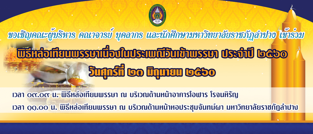 หัวข้อ : ขอเชิญคณะผู้บริหาร คณาจารย์ เจ้าหน้าที่ และนักศึกษา มหาวิทยาลัยราชภัฏลำปาง เข้าร่วมพิธีหล่อเทียนพรรษาเนื่องในประเพณีวันเข้าพรรษา ประจำปี 2560 ในวันศุกร์ที่ 23 มิถุนายน 2560