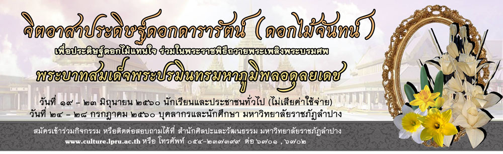 รายละเอียด : สำนักศิลปะและวัฒนธรรม ขอเชิญชวนผู้ที่สนใจเข้าร่วมกิจกรรมจิตอาสาประดิษฐ์ดอกดารารัตน์ (ดอกไม้จันทน์) เพื่อประดิษฐ์ดอกไม้แทนใจ ร่วมในพระราชพิธีถวายพระเพลิงศพ พระบาทสมเด็จพระปรมินทรมหาภูมิพลอดุลยเดช วันที่ 24-28 กรกฎาคม 2560 เป็นรอบของผู้บริหาร คณาจารย์ เจ้าหน้าที่ บุคลากรและนักศึกษา สามารถสมัครเข้าร่วมกิจกรรมหรือติดต่อสอบถามได้ที่ สำนักศิลปะและวัฒนธรรม มหาวิทยาลัยราชภัฏลำปาง เบอร์โทรศัพท์ 054-237399 ต่อ 6701,6702