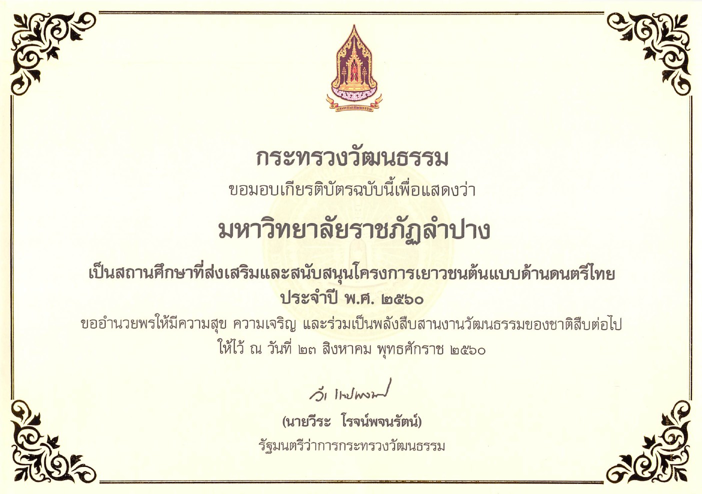 หัวข้อ : สำนักศิลปะและวัฒนธรรม ได้นำนักศึกษาเข้ารับรางวัลเยาวชนต้นแบบด้านดนตรีไทย (ระดับอุดมศึกษา ตัวแทนจังหวัดลำปาง) และเข้ารับมอบเกียรติบัตรของสถานศึกษาต้นสังกัดของเยาวชนต้นแบบ ในพิธียกย่องเชิดชูเกียรติเยาวชนต้นแบบด้านดนตรีไทย ประจำปี 2560
