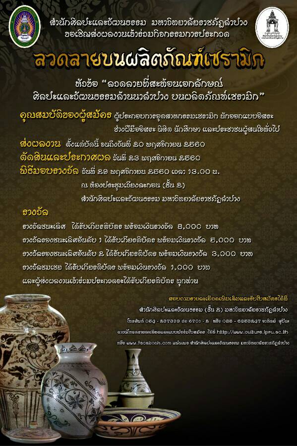 หัวข้อ : หลักเกณฑ์และใบสมัคร การประกวดลวดลายบนผลิตภัณฑ์เซรามิก ในหัวข้อ ลวดลายที่สะท้อนเอกลักษณ์ ศิลปะและวัฒนธรรมล้านนาลำปาง บนผลิตภัณฑ์เซรามิก