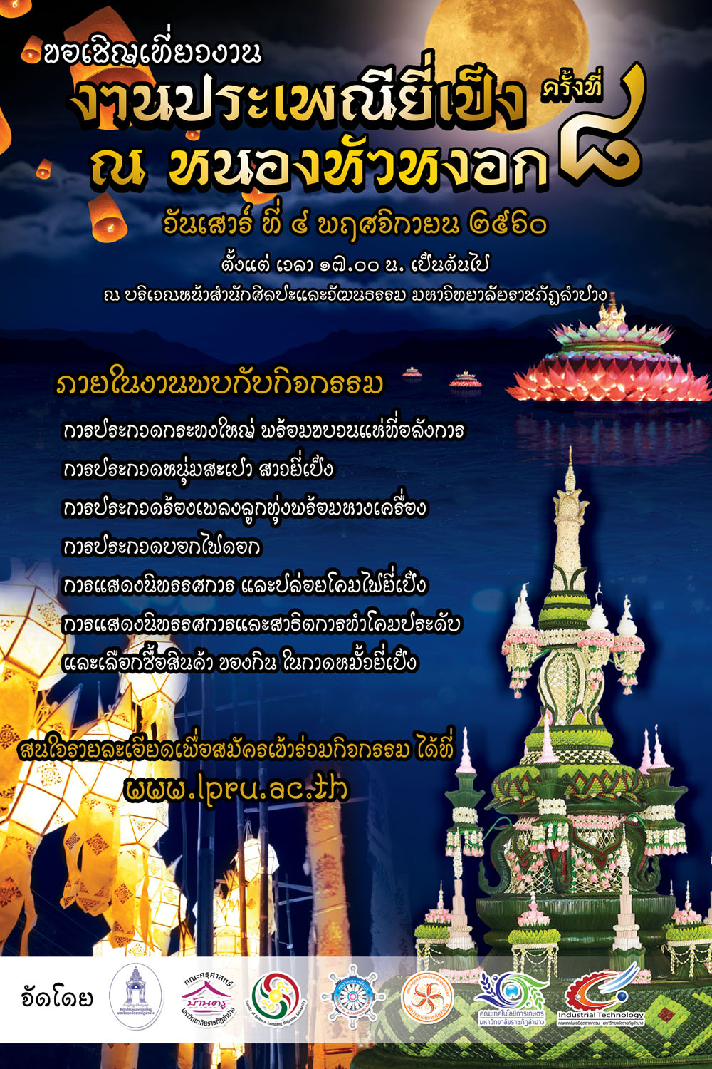 หัวข้อ : ขอเชิญเที่ยวงานประเพณียี่เป็ง ครั้งที่ 8 ณ หนองหัวหงอก วันเสาร์ที่ 4 พฤศจิกายน 2560 ตั้งแต่เวลา 17.00 น. เป็นต้นไป ณ บริเวณหน้าสำนักศิลปะและวัฒนธรรม มหาวิทยาลัยราชภัฎลำปาง