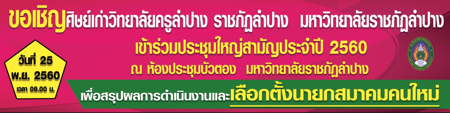 หัวข้อ : ขอเชิญศิษย์เก่า ว.ค. ม.ราชภัฏลำปาง เข้าร่วมประชุมใหญ่สามัญ ประจำปี 2560 ในวันที่ 25 พฤศจิกายน 2560 เวลา 09.00 น. ณ ห้องประชุมบัวตอง มหาวิทยาลัยราชภัฏลำปาง เพื่อสรุปผลการดำเนินงานและเลือกตั้งนายกสมาคมคนใหม่