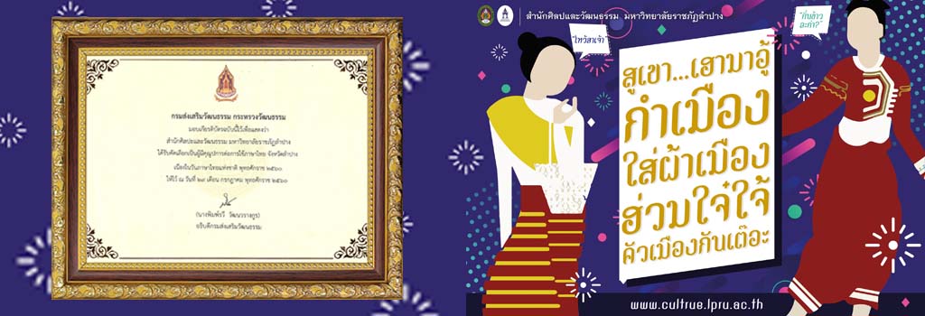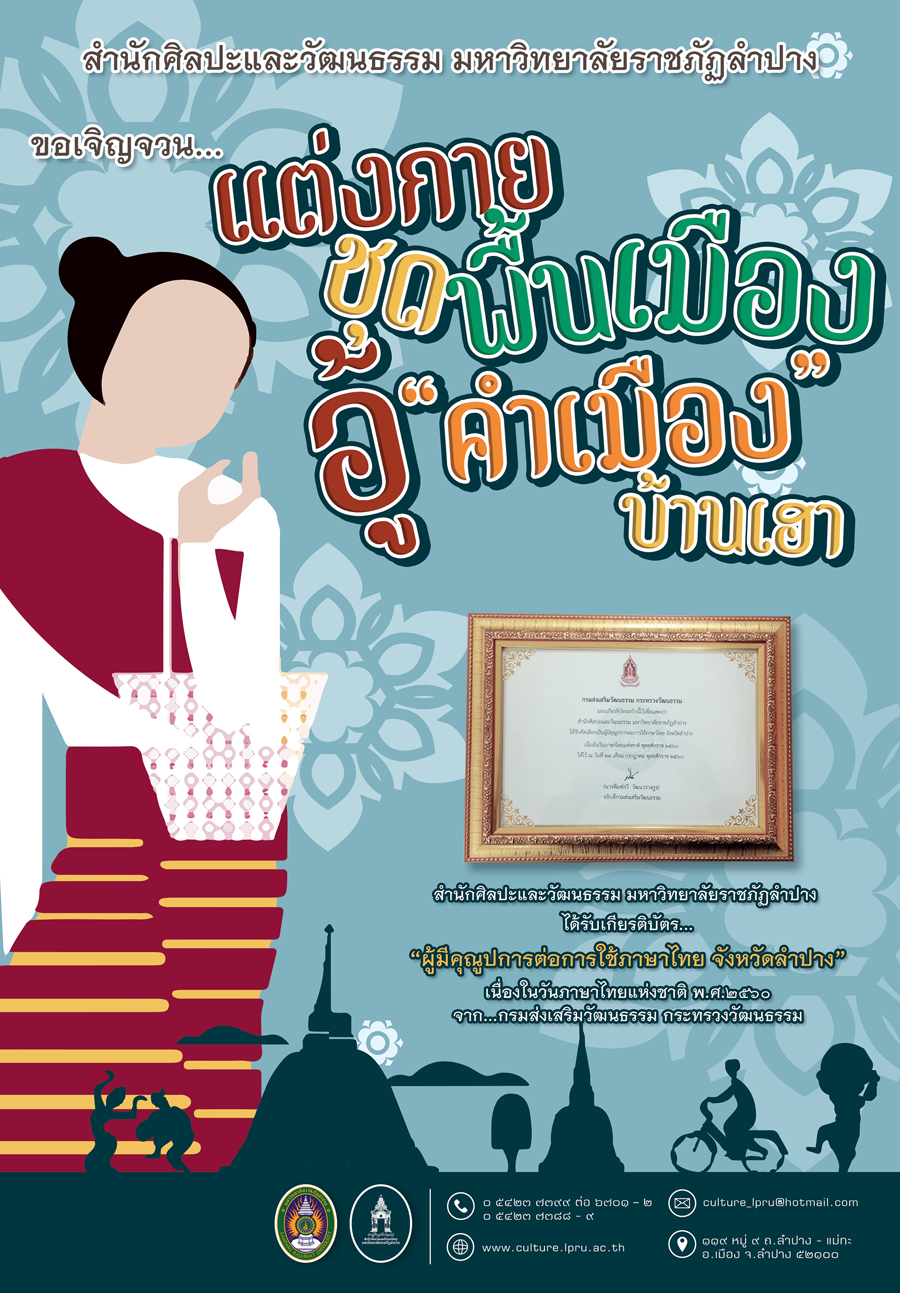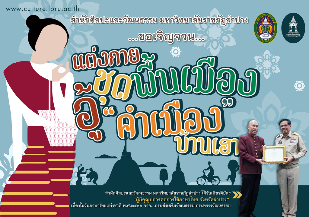 หัวข้อ : สำนักศิลปะและวัฒนธรรม มหาวิทยาลัยราชภัฏลำปาง ได้รับคัดเลือกเป็นผู้มีคุณูปการต่อการใช้ภาษาไทย จังหวัดลำปาง เนื่องในวันภาษาไทยแห่งชาติ พ.ศ.2560 และขอรณรงค์เชิญชวนให้แต่งกายชุดพื้นเมือง อู้คำเมืองบ้านเฮา