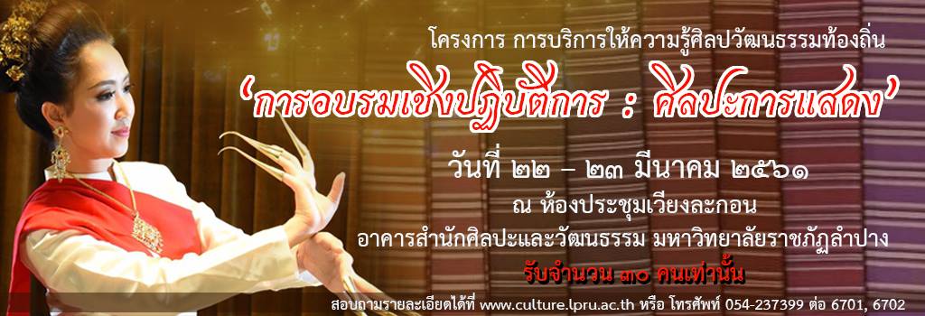 หัวข้อ : สำนักศิลปะและวัฒนธรรม มหาวิทยาลัยราชภัฏลำปาง ขอเชิญชวนท่านเข้าร่วมโครงการการบริการให้ความรู้ศิลปวัฒนธรรมท้องถิ่น ในการอบรมเชิงปฏิบัติการ : ศิลปะการแสดง วันที่ 22 - 23 มีนาคม 2561 ณ ห้องประชุมเวียงละกอน อาคารสำนักศิลปะและวัฒนธรรม มหาวิทยาลัยราชภัฏลำปาง