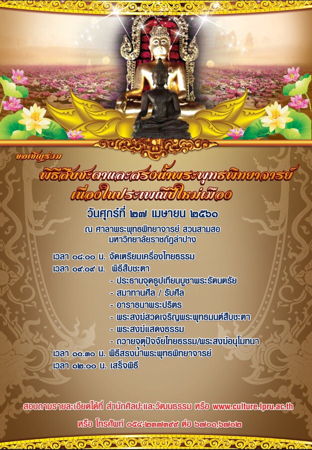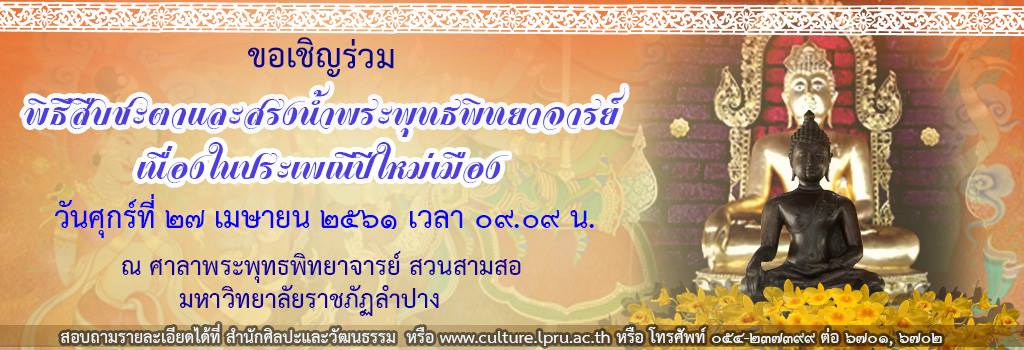 หัวข้อ : สำนักศิลปะและวัฒนธรรม มหาวิทยาลัยราชภัฏลำปาง ขอเชิญชวนเข้าร่วมพิธีสืบชะตาและสรงน้ำพระพุทธพิทยาจารย์ เนื่องในประเพณีปีใหม่เมือง วันศุกร์ที่ 27 เมษายน 2561 ณ ศาลาพระพุทธพิทยาจารย์ สวนสามสอ สำนักศิลปะและวัฒนธรรม มหาวิทยาลัยราชภัฏลำปาง