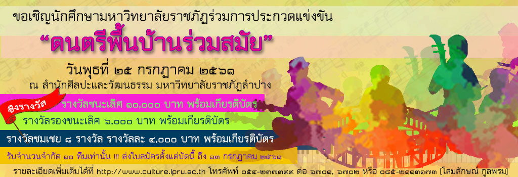 ประกาศปรับเกณฑ์การประกวด การแข่งขันดนตรีพื้นบ้านร่วมสมัย ในวันพุธที่ 25 กรกฎาคม 2561 ณ สำนักศิลปะและวัฒนธรรม มหาวิทยาลัยราชภัฏลำปาง เพื่อชิงรางวัลทุนการศึกษารวมกว่า 48,000 บาท พร้อมเกียรติบัตร สามารส่งใบสมัครได้ตั้งแต่บัดนี้ จนถึง 20 กรกฎาคม 2561
