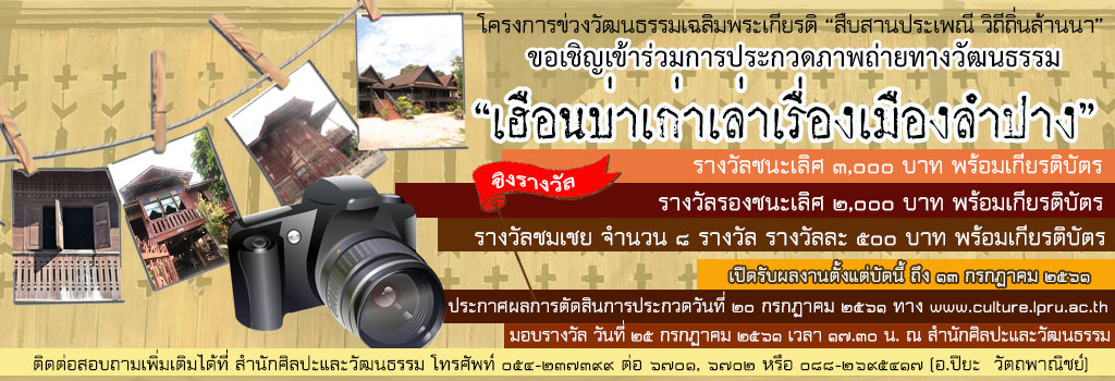 หัวข้อ : ขอเชิญเข้าร่วมการประกวดภาพถ่ายทางวัฒนธรรม เฮือนบ่าเก่าเล่าเรื่องเมืองลำปาง เพื่อชิงรางวัลรวมกว่า 10,000 บาท พร้อมเกียรติบัตร โดยเปิดรับผลงานตั้งแต่บัดนี้จนถึงวันที่ 13 กรกฎาคม 2561