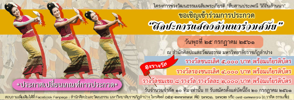 หัวข้อ : ประกาศปรับเกณฑ์การประกวดศิลปะการแสดงล้านนาร่วมสมัย ในวันพุธที่ 25 กรกฎาคม 2561 ณ สำนักศิลปะและวัฒนธรรม มหาวิทยาลัยราชภัฏลำปาง ชิงรางวัลรวมกว่า 25,000 บาท พร้อมเกียรติบัตร เปิดรับสมัครตั้งแต่บัดนี้จนถึงวันที่ 20 กรกฎาคม 2561 รับจำนวนจำกัดเพียง 10 ทีมเท่านั้น