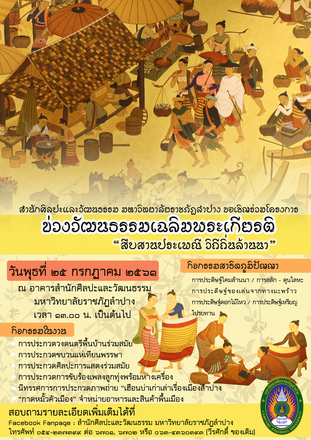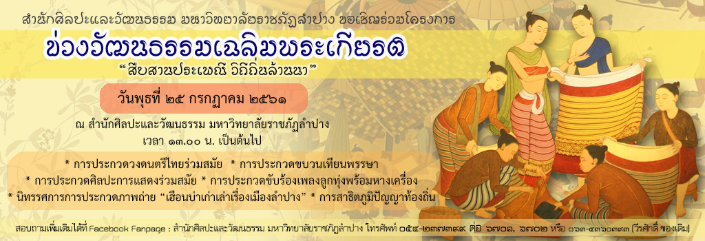 หัวข้อ : ขอเชิญเข้าร่วมโครงการ ข่วงวัฒนธรรมเฉลิมพระเกียรติ สืบสานประเพณี วิถีถิ่นล้านนา วันพุธที่ 25 กรกฎาคม 2561 ณ สำนักศิลปะและวัฒนธรรม มหาวิทยาลัยราชภัฏลำปาง เวลา 13.00 น. เป็นต้นไป