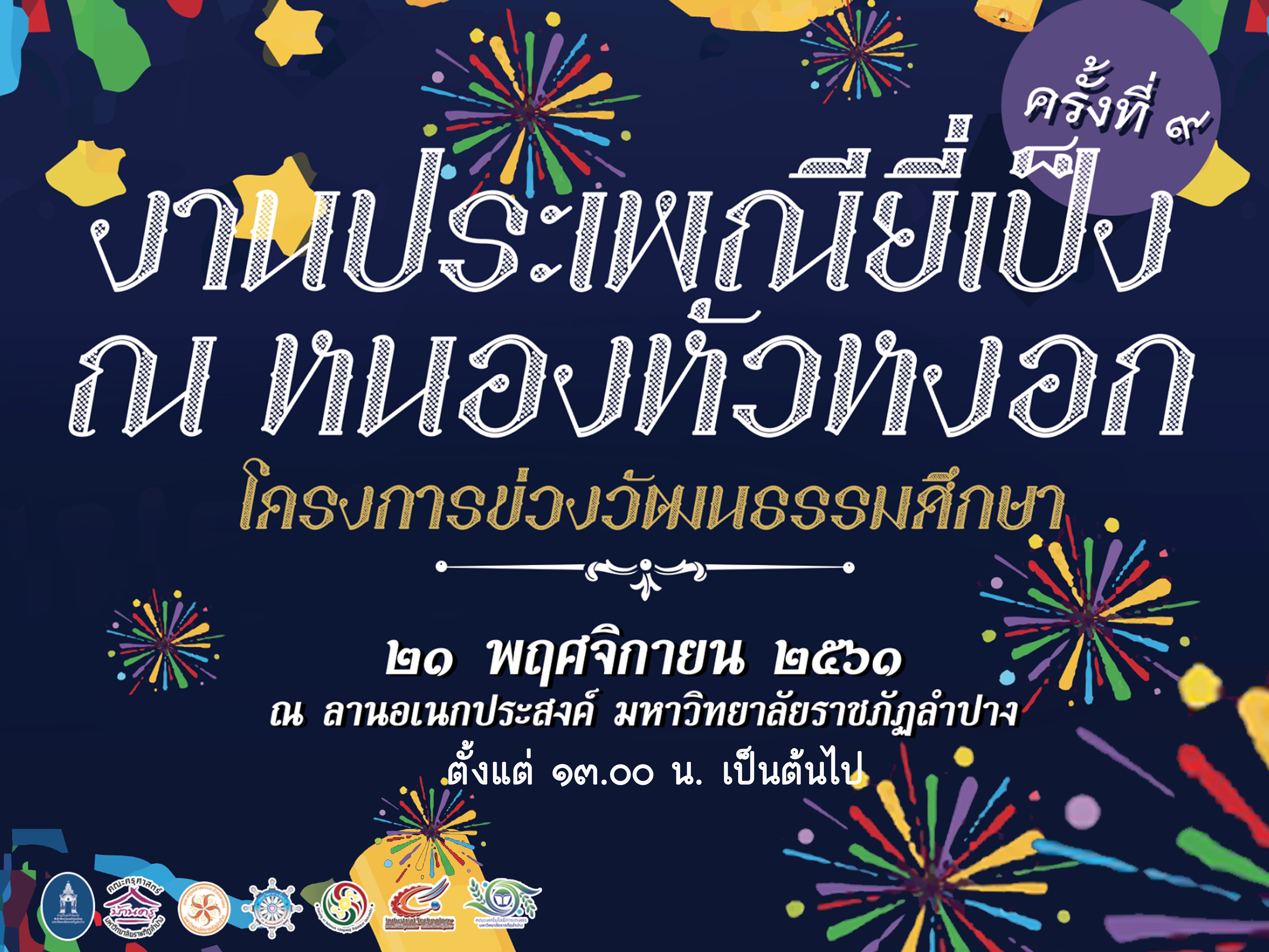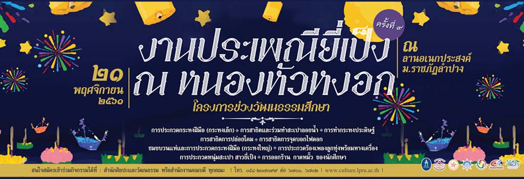 รายละเอียด : ขอเชิญเที่ยวงานประเพณียี่เป็ง ณ หนองหัวหงอก ครั้งที่ 9 ในโครงการข่วงวัฒนธรรมศึกษา วันพุธที่ 21 พฤศจิกายน 2561 ตั้งแต่เวลา 13.00 น. เป็นต้นไป ณ บริเวณลานอเนกประสงค์ มหาวิทยาลัยราชภัฎลำปาง ภายในงานพบกับกิจกรรม