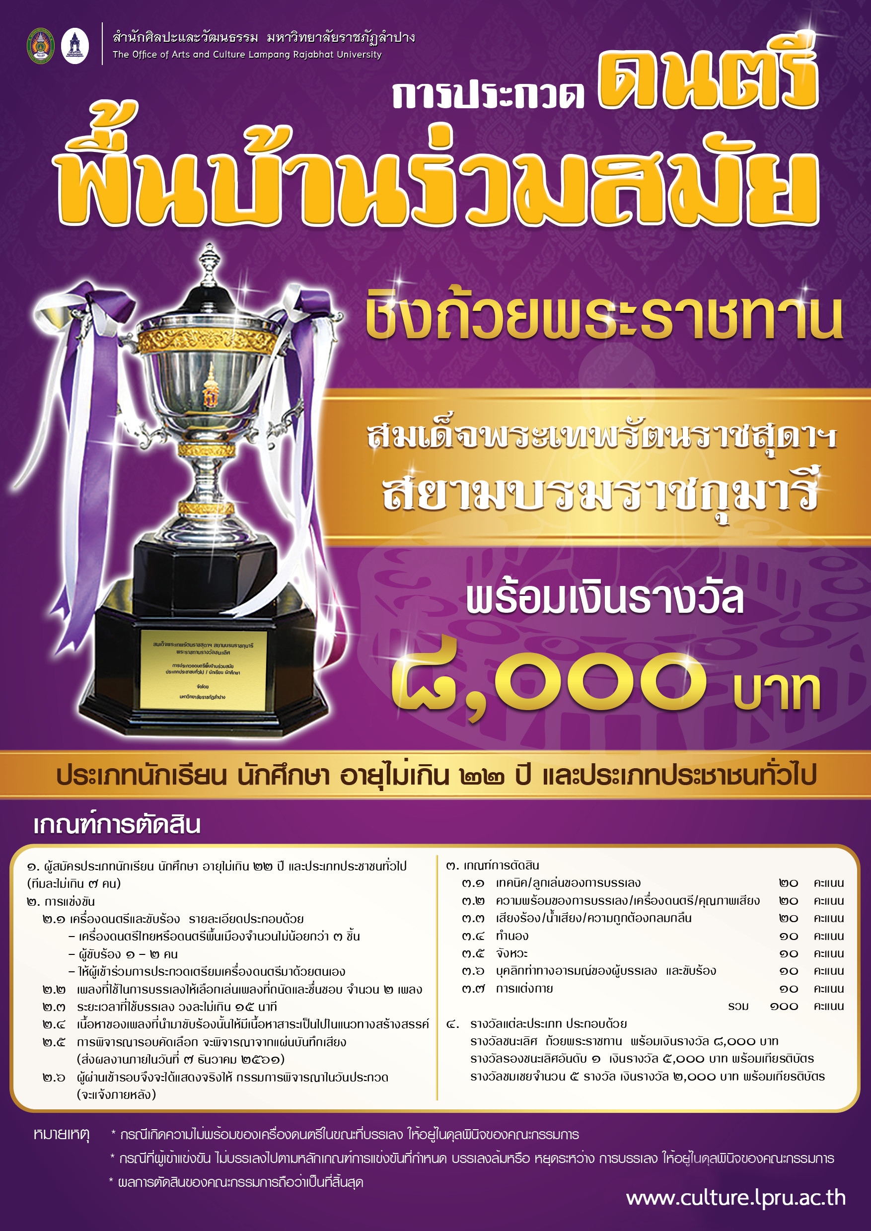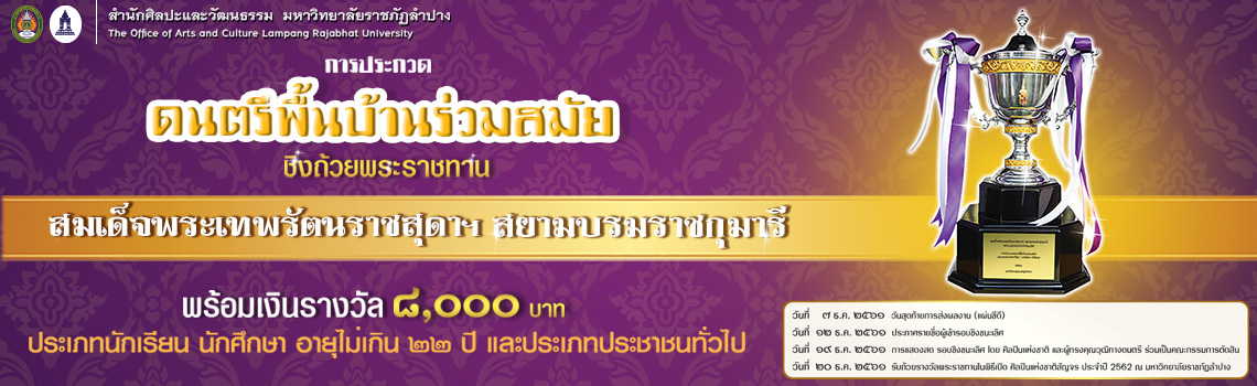หัวข้อ : ขอเชิญเข้าร่วมการประกวดดนตรีพื้นบ้านร่วมสมัย ชิงถ้วยพระราชทานถ้วยพระราชทานสมเด็จพระเทพรัตนราชสุดาฯ สยามบรมราชกุมารี ประเภทนักเรียน นักศึกษา อายุไม่เกิน 22 ปี และประเภทประชาชนทั่วไป ณ สำนักศิลปะและวัฒนธรรม มหาวิทยาลัยราชภัฏลำปาง
