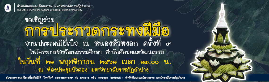 ขอเชิญเข้าร่วมกาประกวดกระทงฝีมือ งานประเพณียี่เป็ง ณ หนองหัวหงอก ครั้งที่ 9 ในโครงการข่วงวัฒนธรรมศึกษา สำนักศิลปะและวัฒนธรรม โดยการทำการประกวดในวันที่ 21 พฤศจิกายน 2561 ณ ห้องประชุมบัวตอง มหาวิทยาลัยราชภัฏลำปาง ลงทะเบียนเวลา 13.0-13.30 น. และเริ่มการประกวดเวลา13.30-16.30 น จำกัดเวลา 3 ชั่วโมง โดยรับสมัคร นักเรียน - นักศึกษา ทีมละ 3 คน รับสมัครตั้งแต่บัดนี้เป็นต้นไปถึง 16 พฤศจิกายน 2561ด่วน!! รับจำนวนจำกัดเพียง 10 ทีมเท่านั้น สามารถดาวน์โหลดเกณฑ์การประกวดและใบสมัคร ตามไฟล์แนบด้านล่าง
