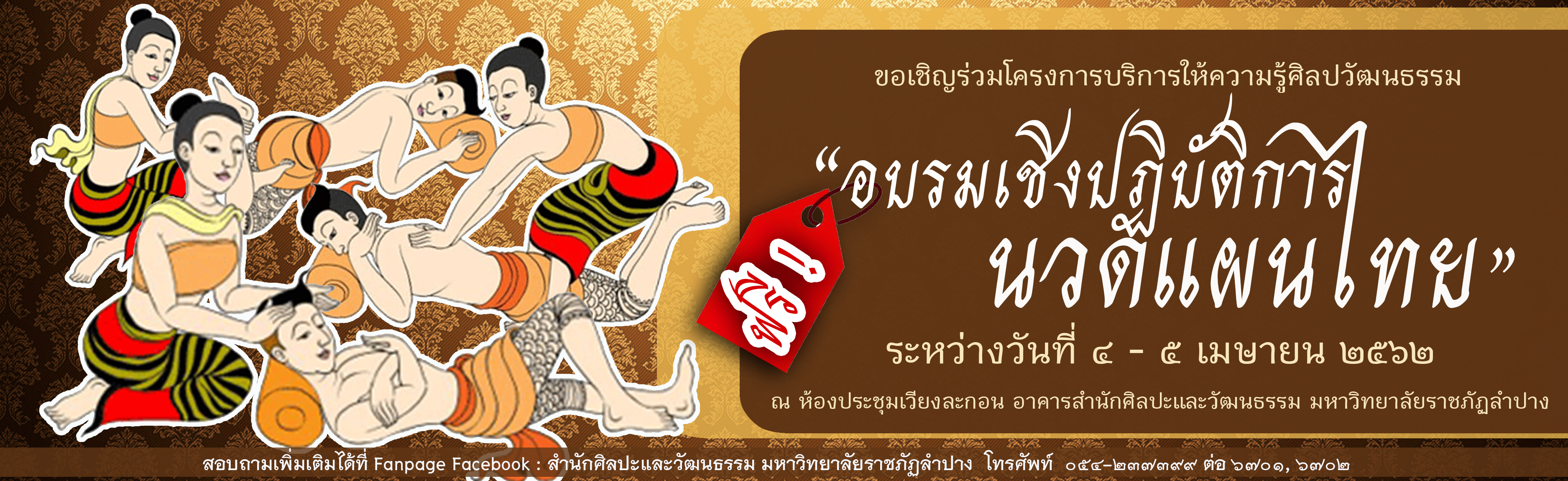 รายละเอียด : สำนักศิลปะและวัฒนธรรม มหาวิทยาลัยราชภัฏลำปาง ขอเชิญเข้าร่วมโครงการบริการให้ความรู้ศิลปวัฒนธรรม "อบรมเชิงปฏิบัติการ : นวดแผนไทย" ระหว่างวันที่ ๔ - ๕ เมษายน ๒๕๖๒ เวลา ๐๘.๓๐ - ๐๙.๐๐ น. ณ ห้องประชุมเวียงละกอน (ชั้น ๒) อาคารสำนักศิลปะและวัฒนธรรม มหาวิทยาลัยราชภัฏลำปาง อบถามเพิ่มเติมได้ที่ Fanpage Facebook : สำนักศิลปะและวัฒนธรรม มหาวิทยาลัยราชภัฏลำปาง โทรศัพท์ ๐๕๔-๒๓๗๓๙๙ ต่อ ๖๗๐๑, ๖๗๐๒