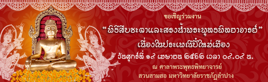 รายละเอียด : ขอเชิญร่วม “พิธีสืบชะตาและสรงน้ำพระพุทธพิทยาจารย์” เนื่องในประเพณีปี๋ใหม่เมือง วันศุกร์ที่ ๑๙ เมษายน ๒๕๖๒ เวลา ๐๙.๐๙ น. ณ ศาลาพระพุทธพิทยาจารย์ สวนสามสอ สำนักศิลปะและวัฒนธรรม มหาวิทยาลัยราชภัฏลำปาง