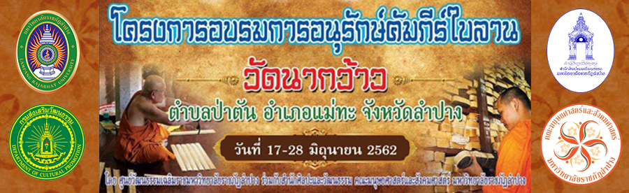 รายละเอียด : สำนักศิลปะและวัฒนธรรม และคณะมนุษยศาสตร์และสังคมศาสตร์ มหาวิทยาลัยราชภัฏลำปาง ร่วมกับ ศูนย์วัฒนธรรมเฉลิมราชมหาวิทยาลัยราชภัฏลำปาง ดำเนินโครงการอบรมการอนุรักษ์คัมภีร์ใบลานวัดนากว้าว ตำบลป่าตัน อำเภอแม่ทะ จังหวัดลำปาง ระหว่างวันที่ ๑๗ - ๒๘ มิถุนายน ๒๕๖๒