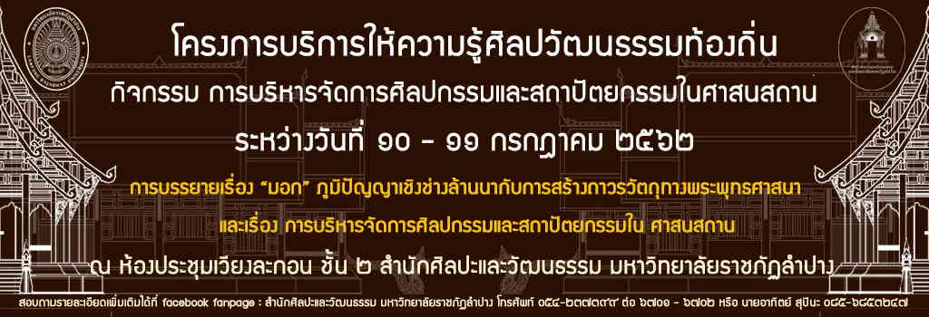 รายละเอียด : สำนักศิลปะและวัฒนธรรม มหาวิทยาลัยราชภัฏลำปาง ขอเชิญเข้าร่วมโครงการบริการให้ความรู้ศิลปวัฒนธรรมท้องถิ่น "กิจกรรมการบริหารจัดการศิลปกรรมและสถาปัตยกรรมในศาสนสถาน" ระหว่างวันที่ ๑๐ - ๑๑ กรกฎาคม ๒๕๖๒ ณ ห้องประชุมเวียงละกอน ชั้น ๒ สำนักศิลปะและวัฒนธรรม มหาวิทยาลัยราชลำปาง (ไม่เสียคา่ใช้จ่ายในการร่วมกิจกรรม )