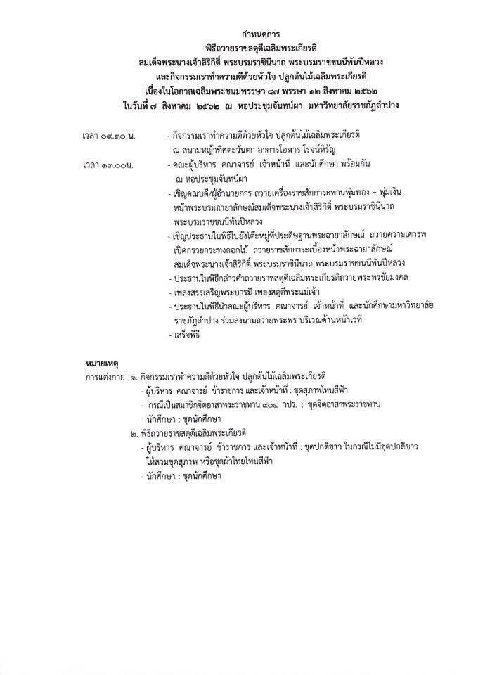 รายละเอียด : มหาวิทยาลัยราชภัฏลำปาง ขอเชิญคณะผู้บริหาร คณาจารย์ เจ้าหน้าที่และนักศึกษา ร่วมพิธีถวายราชสดุดีเฉลิมพระเกียรติสมเด็จพระนางเจ้าสิริกิติ์ พระบรมราชินีนาถ พระบรมราชชนนีพันปีหลวง และกิจกรรมเราทำความดีด้วยหัวใจ ปลูกต้นไม้เฉลิมพระเกียรติ เนื่องในโอกาสมหามงคลเฉลิมพระชนมพรรษา 87 พรรษา 12 สิงหาคม 2562 ในวันที่ 7 สิงหาคม 2562 เวลา 13.00 เป็นต้นไป