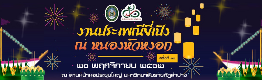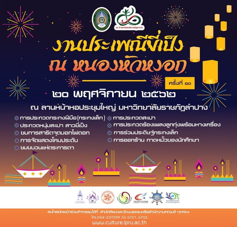 รายละเอียด : สำนักศิลปะและวัฒนธรรม มหาวิทยาลัยราชภัฏลำปาง ร่วมกับ คณะครุศาสตร์ คณะวิทยาศาสตร์ คณะมนุษยศาสตร์และสังคมศาสตร์ คณะวิทยาการจัดการ คณะเทคโนโลยีอุตสาหกรรม และคณะเทคโนโลยีการเกษตร ขอเชิญเที่ยวงานประเพณียี่เป็ง ณ หนองหัวหงอก ครั้งที่ ๑๐ ในวันพุธที่ ๒๐ พฤศจิกายน ๒๕๖๒ ณ ลานหน้าหอประชุมใหญ่ มหาวิทยาลัยราชภัฏลำปาง ภายในงานพบกับกิจกรรม