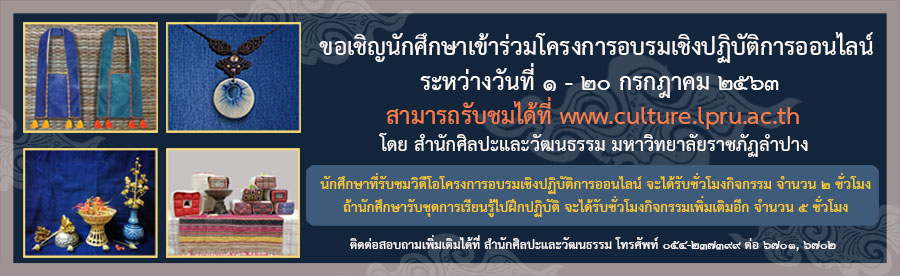 รายละเอียด : สำนักศิลปะและวัฒนธรรม มหาวิทยาลัยราชภัฏลำปาง ขอเชิญนักศึกษาเข้าร่วมโครงการอบรมเชิงปฏิบัติการออนไลน์ ระหว่างวันที่ ๑ - ๒๐ กรกฎาคม ๒๕๖๓