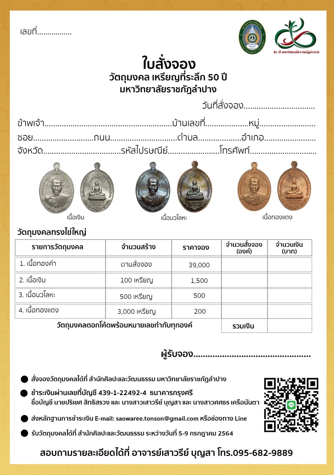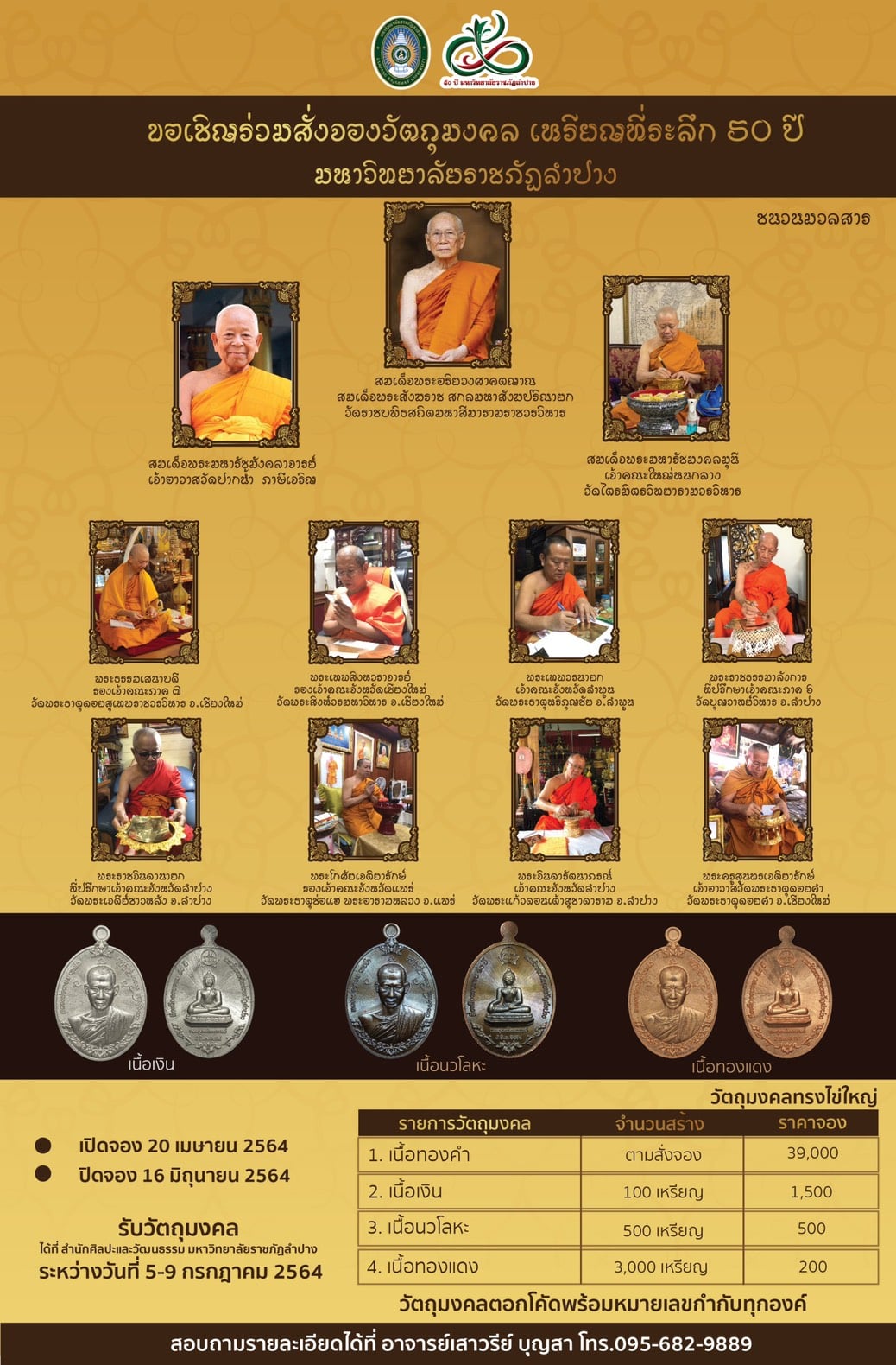 หัวข้อ : ขอเชิญร่วมสั่งจองวัตถุมงคล เหรียญที่ระลึก 50 ปี มหาวิทยาลัยราชภัฏลำปาง