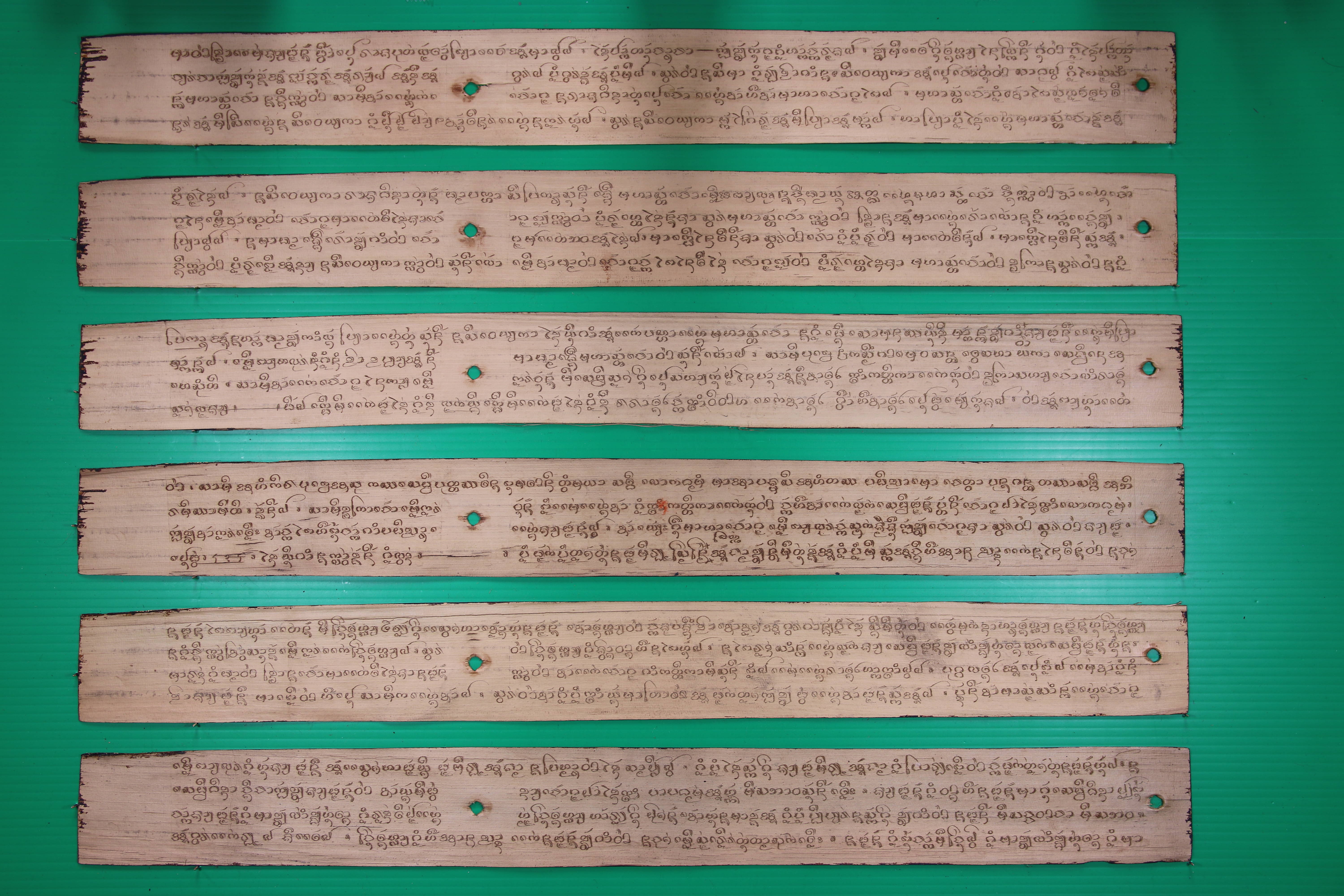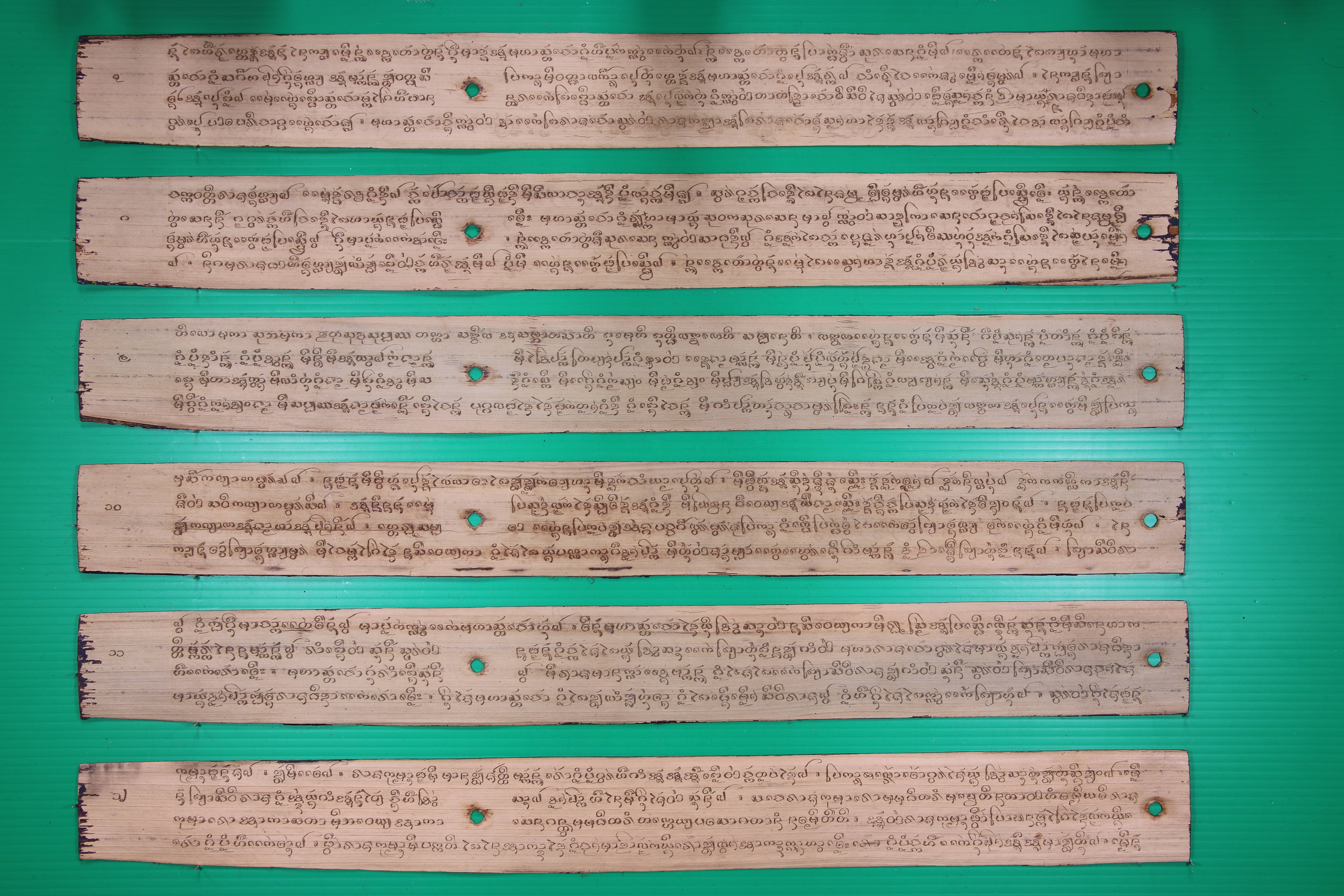 ข้อความท้ายเอกสาร | ผูก 1 จ.ศ.1291 ตัวปลีกดสะง้า เข้ามาในเดือน 11 เดือนเกี๋ยวลง 5 ค่ำ พร่ำว่าวันอาทิตย์แล วันที่ 12 ตุลาคม 2473 ตัวปลีมะเมียแล แล้วยามแตรขึ้นสู่เที่ยง พรหมเสนภิกขุ เขียนเมื่ออยู่ปฏิบัติธุเจ้าวงศ์วัดค่าเนิ้งดอนไชย ขอหื้อข้าได้ตั้งอยู่ในธัมม์ 8 ประการไพไจ้ๆ ผูก 2 สระเด็จแล้วเดือนยี่ ขึ้น 12 ค่ำ พร่ำว่าได้วันอาทิตย์ ยามแตรขึ้นสู่เที่ยง พระแจ้พรหมเสนภิกขุ ลิขิต เพื่อหื้อเป็นเกินก่ายฟ้านำเอาตนตัวแห่งข้ากับทังพ่อแม่พี่น้องแห่งข้าจิ่มเทิอะ จ.ศ. 1291 ตัวหนังสือข้าข้อยบ่งามสักคาบแล ผูก 3 จ.ศ. 1292 ปลีกดสะง้า เดือนเจี๋ยง แรมค่ำ 1 พร่ำว่าได้วันพุธ ก็บัวรมวล ปู่หนานธัมมลังกาลิขิตแล้วยามแตรขึ้นสู่เที่ยงเบี่ยงกินตอนวันนั้นแล ผูก 4 สัทธาปู่หนานธัมมลังกาลิขิต ปลีกดสะง้า จ.ศ. 1292 ตัว เดือนเกี๋ยง 9 ค่ำ วัน 4 ยามกองงาย ธัมม์วัดค่าเนิ้งธุเจ้าวงศ์แล ผูก 5 ปู่หนานธัมมลังกา ปลีกดสะง้า จ.ศ. 1292 ตัว เดือนยี่ขึ้น 3 ค่ำ วันศุกร์ ผูก 6 ด้วยเตชะกุสลบุญอันข้าได้สร้างธัมม์พระเจ้าผูกนี้ ข้าจักแผ่ผายอยายบุญอันข้าได้เขียนธัมม์นี้ไพรอดรุกขเทวดา พระยาอินทา พระยาพรหม พระยายม และท้าวจตุโลกทัง 4 แลนางธอรณีตนเลียบโลกทังมวลแล ขออนุโมทนาด้วยข้าจิ่มเทิอะ ข้าจักแผ่นาบุญอันข้าได้สร้างธัมม์พระเจ้าผูกนี้รอดไพเถิงพ่อแม่ข้าแลญาติวงศากับทังภริยาแลบุตรแห่งข้า ขอหื้อได้ไพเกิดชั้นฟ้าแลเมืองนิพพานจิ่มเทิอะ ขอหื้อข้ามีประหยาปัญญาเหมือนดั่งเจ้ามโหสถ ขอหื้อมีความอดเหมือนดั่งเจ้าเตชะเม ขอหื้อข้ารู้จักเทสนาธัมม์ไพบ่ขาด ขอหื้อข้าได้ร่วมนักปราชญ์เจ้าตนมีสีล ขอหื้อข้าได้กินได้ทานไพบ่ขาด ขอหื้ออย่าได้ประมาทคุณธรรม จ.ศ. 1292 ปลีกดสะง้า ระดูเดือนยี่ แรม 11 ค่ำ แลบ้านนากว้าว ปางเมื่อสวาธุเจ้าอภิวงศ์แลเจ้าเหิย ผูก 7 จ.ศ. 1292 ปลีเปิกสะง้า เขียนแล้วเดือนยี่ แรม 12 แล้วตะวันแลงแลนายเหิย เขียนแล้ววัน 2 ปถมะมูลละสัทธาหมายมีหน้อยพรหมเสนาได้สร้างไว้ค้ำชูพุทธสาสนากับวัดค่าเนิ้ง สวาธุเจ้าวงศ์ ผูก 8 ใค่สิกล้ำไพเสียแล้ว บางทีวันตัว 2 ตัว เพราะมันใค่สิกเหลือใจข้าเสียแล้ว พี่ธุพี่พระเหิย ว่าแท้ก็ผ่อเอาเทิอะ บางทีก็ใหย่บางทีก็น้อย บ้านข้าอยู่ศรีถ้อยน้ำรัดแล ผูก 9 เขียนปางเมื่อปฏิบัติสวาธุเจ้าวงศ์วัดนากว้าวไชยวันนั้นแล ผูก 10 ยามตะวันชายลงแลงแล้ว จ.ศ. 1292 ตัวปลีกดสะง้า เดือน 3 ขึ้น 4 ค่ำ พร่ำว่าได้วัน 2 เข้ามาระดูหนาวแล พระเจ้าพรหมเสนภิกขุลิขิต ปางอยู่ปฏิบัติสวาธุเจ้า วัดค่าเนิ้งวันนั้นแล ผูก 11 พ.ศ. 2473 ปลีมะเมีย เขียนแล้วเดือน 3 ออก 13 ค่ำ พร่ำว่าได้วัน 4 หั้นแล เขียนปางเมื่ออยู่ปฏิบัติสวาธ