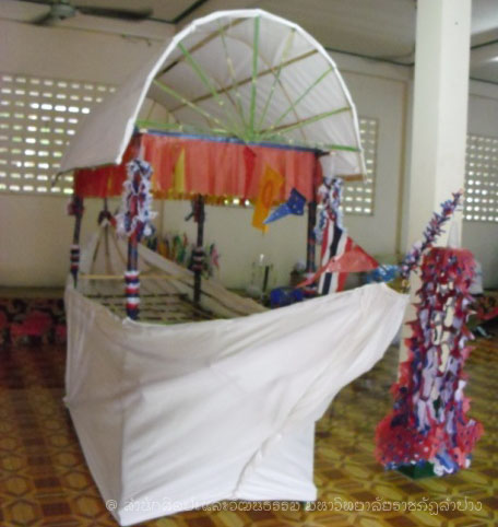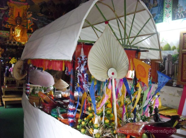 การจัดปอยข้าวสังฆ์ เจ้าภาพจัดเตรียมเครื่องปัจจัยไทยทานตามกุศลเจตนา และความเชื่อ ซึ่งนิยมทำเป็นบ้านจำลอง มีเครื่องใช้ครบถ้วน ทั้งที่นอนหมอนมุ้งถ้วยชามเสื้อผ้ารองเท้าแว่นหวีและมีเครื่องบริโภคคือข้าวน้ำและอาหารตลอดจนหมากเมี่ยงพลูบุหรี่ต่าง ๆ โดยครบถ้วน โดยเฉพาะหญิงที่ตายทั้งกลมหรือตายเพราะการคลอดหรือหลังคลอดนั้น ถือว่าหญิงนั้นมีกรรมหนัก จะทำเรือสำเภาขนาดประมาณ 5 เมตร กว้าง 2 เมตรพร้อมทั้งพายและอุปกรณ์จับปลาต่าง ๆ ใส่ลงในเรือนั้นด้วย โดยเชื่อว่าสำเภาจะพาไปสู่สุคติภพและขณะเดียวกันเครื่องมือจับสัตว์ก็ใช้ช่วยหากินในระหว่างเดินทางไปด้วย